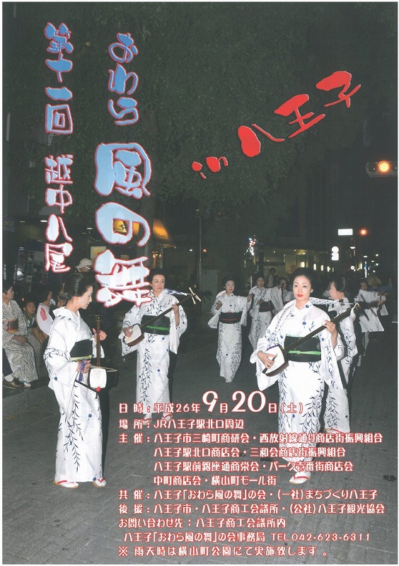 この事業は、全国的にも大変人気のある富山県八尾の「おわら風の盆」を八王子に招聘し、市民の方々はもとより他市・他県の方々にも伝統文化を観覧戴き、市在住の「花乃実おわら踊り研究会」、「越中おわら節を楽しむ会」、「武州越中おわら節の会」、中町芸者衆の方々にも参加協力戴き行ってきております。