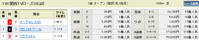というわけで当然の如く 残念な結果になりましたとさ それにしてもローズステークスの2着は15番人気の馬でした。 こういうレース当てたいわ~!!