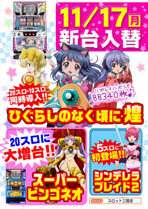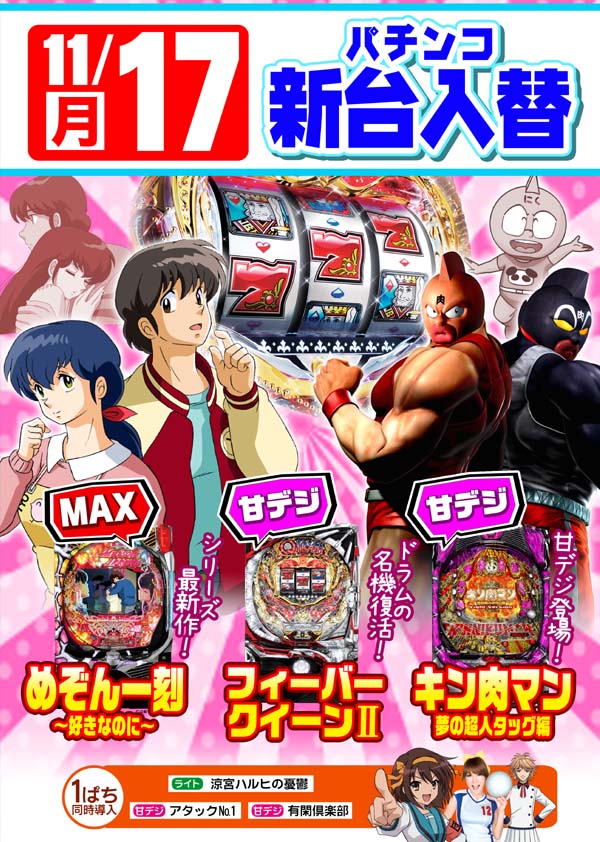 [第170回]明日11/17(月)は新台入替です☆